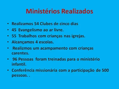 Ficamos 22 dias participando do projeto da APEC -Aliança Pró Evangelização das Crianças. Realizamos evangelismo pessoal, treinamento para professores, clubes Bíblicos e participamos de um simpósio para líderes.